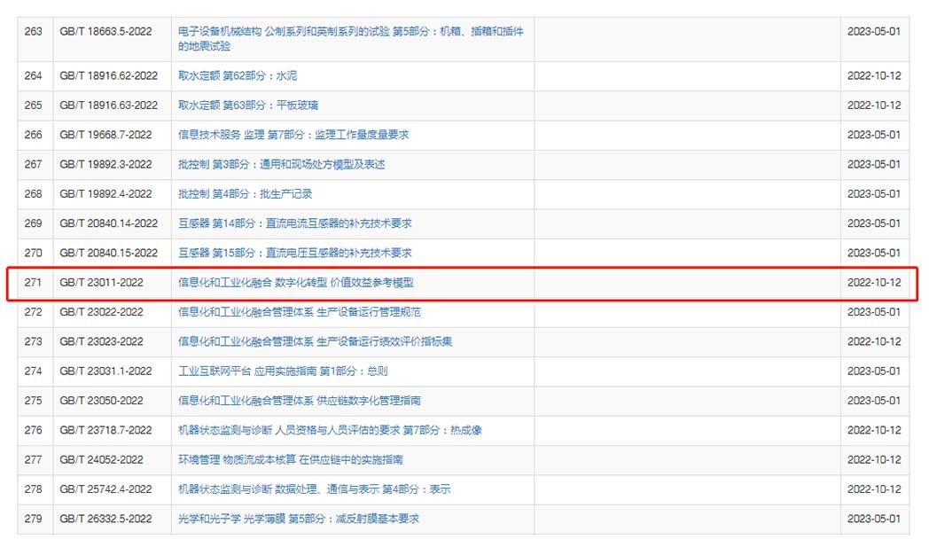 2022年10月14日,国家市场监督管理总局(国家标准化管理委员会)发布2022年第13号中国国家标准公告,批准国家标准GB/T 23011-2022《信息化和工业化融合 数字化转型 价值效益参考模型》(简称《数字化转型 价值效益参考模型》)正式发布,该标准是立足两化融合发展过程中数字化转型效益衡量这以关键需求研制发布的一项重要国家标准,对以标准引领量化深度融合、加快新型工业化发展具有重要意义。